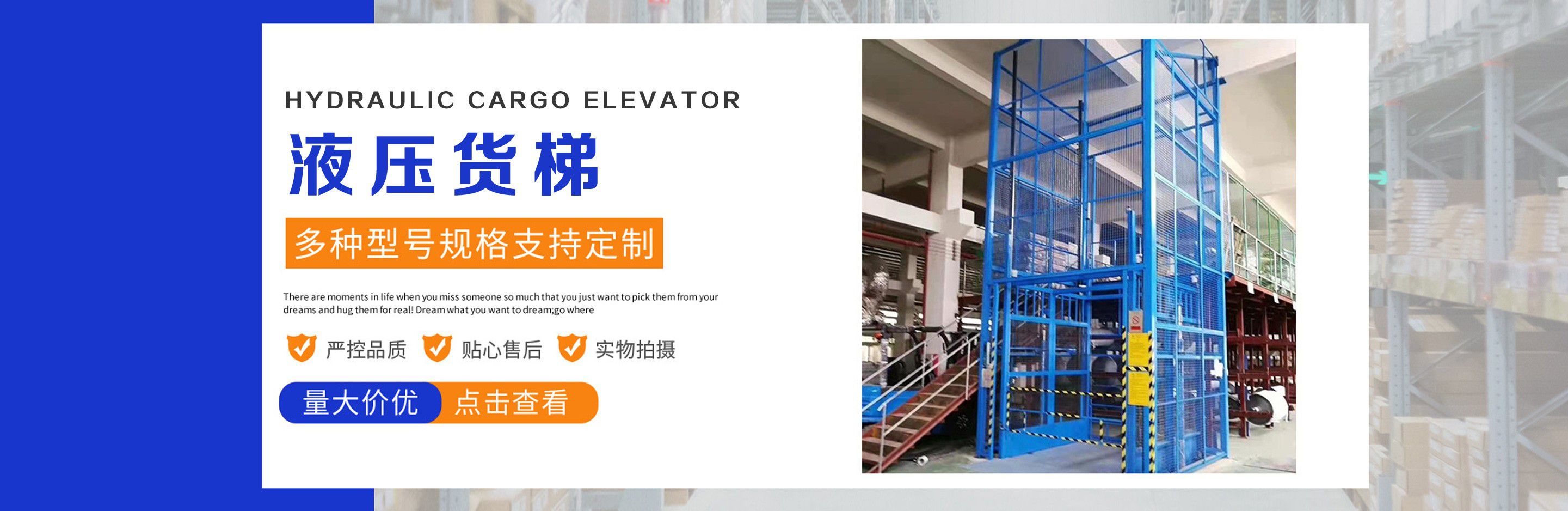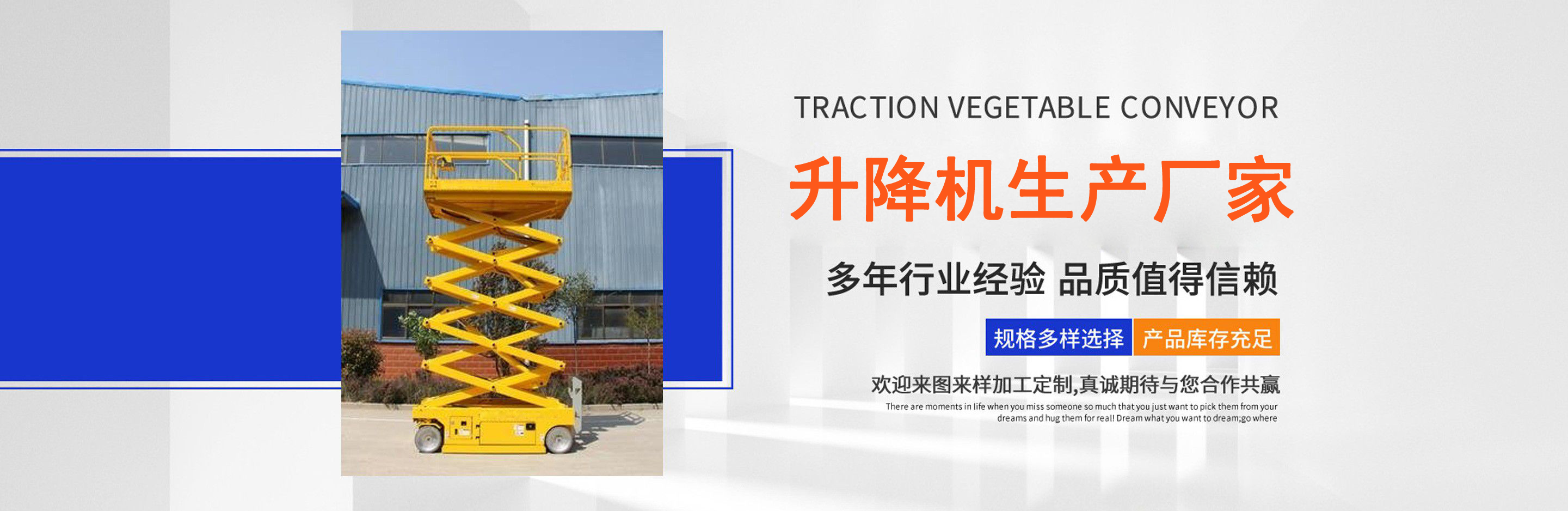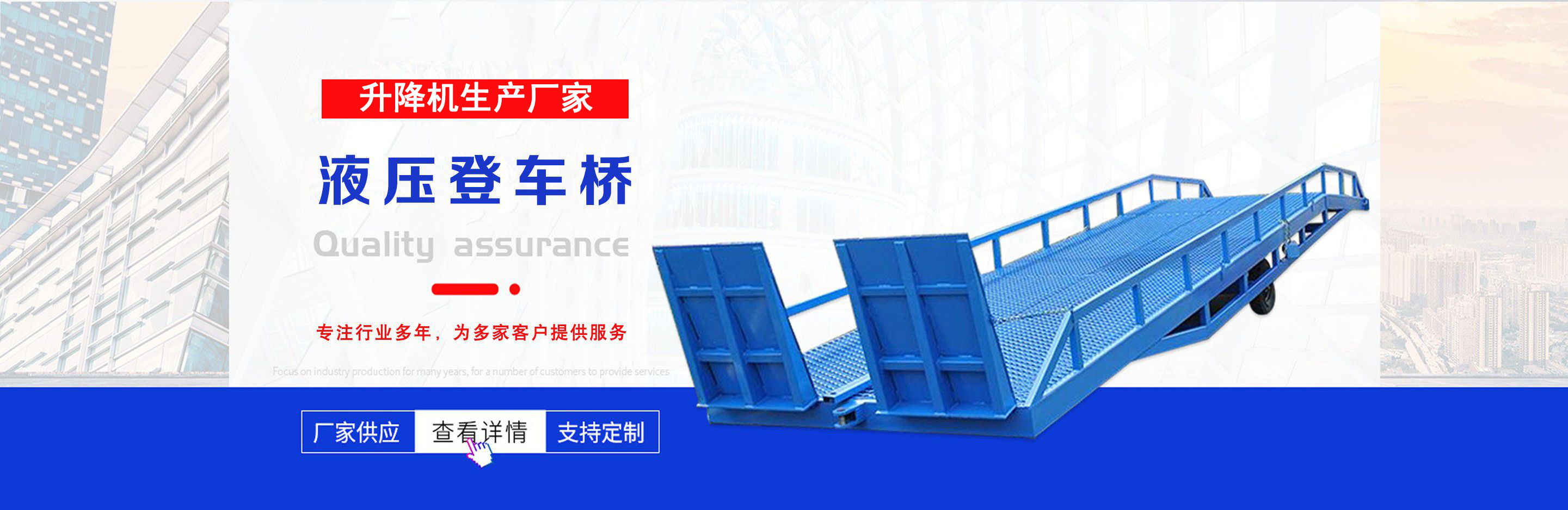 升降機生產廠家是專業從事升降平臺,液壓貨梯,卸豬臺,平板拖車,液壓提升機,移動式升降機,升降平臺車,高空作業設備,貨梯廠家,液壓登車橋等升降機械產品制造十余年,服務過各大國內外企業?! ∽怨緞摿⒁詠?,經過長期對液壓升降臺的研制和探索,積累了豐富的專業制造技術和寶貴經驗。憑借豐富的專業技術及不斷開拓創新的精神,現已成為專業于升降機械的公司?! ¢L期以來,憑借公司不斷的壯大及對液壓技術的不斷改進和探索。能根據客戶不同的要求設計一套合理、完善的方案供客戶參考。現有產品:升降平臺,液壓貨梯,卸豬臺,平板拖車,液壓提升機,移動式升降機,升降平臺車,高空作業設備,貨梯廠家,液壓登車橋等。本產品在各類工礦企業、港口物流以及其它領域均發揮著重要的作用。始終以“以信譽求生存、以技術求發展”為本廠的經營理念。只要你選購我廠的產品,無論你身在何方都能得到我們迅捷優良的服務?! 」咀猿闪⒁呀泚肀局?quot;團結、求實、創新、互贏"的理念,以先進的技術和服務,為客戶建造滿意的產品。幾年來受到廣大客戶的好評。...